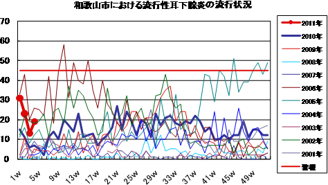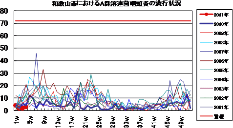 和歌山市では、2006年では第10週をピークに流行が続きましたが、2007年・2008年は大きな流行がなく少数報告にとどまりました。2009年は、第30〜32週ごろをピークに緩やかな流行を示しました。2010年は、おおむね10-20件前後でほぼ横ばいの傾向でした。