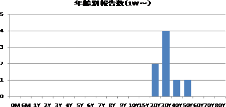 2011年第1週には、31件と報告数の増加が見られました。第2週では23件、第3週13件、第4週19件と減少傾向です。年齢別では、0歳から10-14歳までで報告があります。