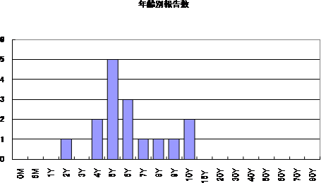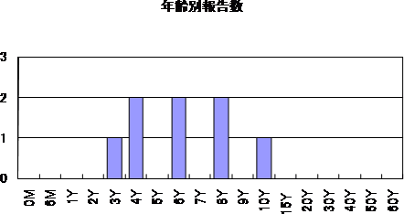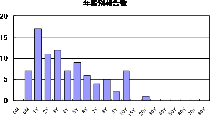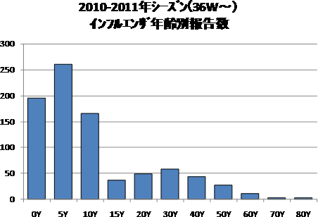 今シーズン(2010-2011年)は、第45週により10件前後で報告がみられておりましたが、第49週では18件、第50週16件から、第51週26件に増加しています。第52週は19件、第1週12件、第2週10件とやや減少、第3週では1件、第4週2件、第5週、第6週は共に5件と定常傾向ですが、未だ流行期なので、まだしばらく動向に注意が必要です。年齢別では、0歳〜5歳の範囲で報告がみられています。