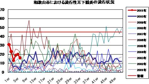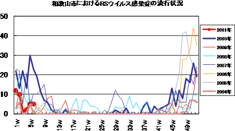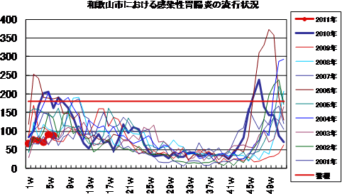 和歌山市では、2006年では第10週をピークに流行が続きましたが、2007年・2008年は大きな流行がなく少数報告にとどまりました。2009年は、第30〜32週ごろをピークに緩やかな流行を示しました。2010年は、おおむね10-20件前後でほぼ横ばいの傾向でした。