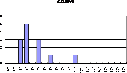 2011年第1週には、31件と報告数の増加が見られました。第2週では23件、第3週13件、第4週19件、第5週20件、第6週16件と定常傾向です。年齢別では、0歳から10-14歳までで報告があります。