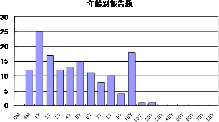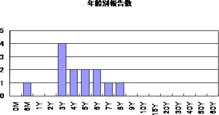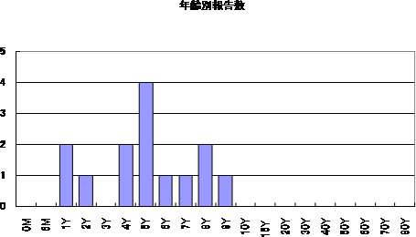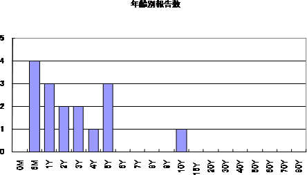 今シーズン(2010-2011年)は、第45週により10件前後で報告がみられておりましたが、第49週18件、第50週16件から、第51週26件に増加しています。以降徐々に減少傾向です。第3週以降は5件以内の報告となっています。年齢別では、0歳〜5歳の範囲で報告がみられています。