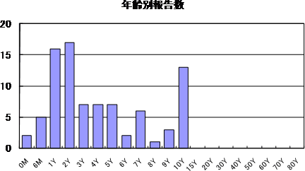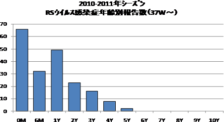 今シーズン(2010-2011年)は、第45週により10件前後で報告がみられておりましたが、第49週18件、第50週16件から、第51週26件に増加しています。以降徐々に減少傾向です。第3週以降は5件以内の報告となっています。年齢別では、0歳〜5歳の範囲で報告がみられています。
