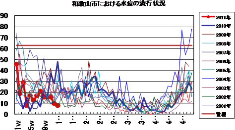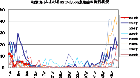 和歌山市では、2006年では第10週をピークに流行が続きましたが、2007年・2008年は大きな流行がなく少数報告にとどまりました。2009年は、第30〜32週ごろをピークに緩やかな流行を示しました。2010年は、おおむね10-20件前後でほぼ横ばいの傾向でした。