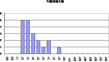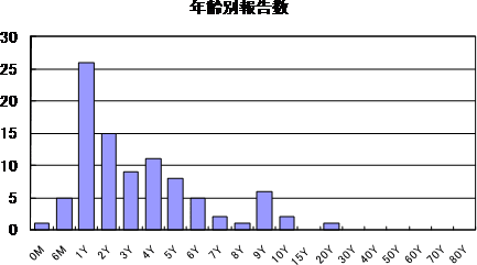 今シーズン(2010-2011年)は、第45週により10件前後で報告がみられておりましたが、第49週18件、第50週16件から、第51週26件に増加しています。以降徐々に減少傾向です。第3週以降は5件以内の報告となっています。年齢別では、0歳〜5歳の範囲で報告がみられています。