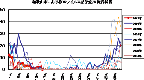 和歌山市では、2006年では第10週をピークに流行が続きましたが、2007年・2008年は大きな流行がなく少数報告にとどまりました。2009年は、第30〜32週ごろをピークに緩やかな流行を示しました。2010年は、おおむね10-20件前後でほぼ横ばいの傾向でした。