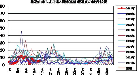 2011年も、5件未満で推移していましたが、第6週〜第9週まで10件前後と若干増加認められました。第7週、劇症型の報告が1件(90歳女性)ありました