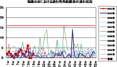 2011年第1週には31件と報告数の増加が見られました。第2週以降は20件から10件前後で推移していますが、第15週7件、第16週4件と減少傾向です。