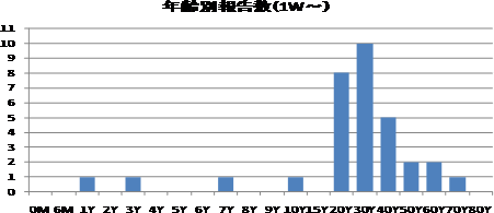 2011年は、1〜3件の報告が続いていますが、第13週は6件に増加、第14週・15週は0件でした。年齢別では30歳代をピークに幅広い年齢層で報告がみられます。