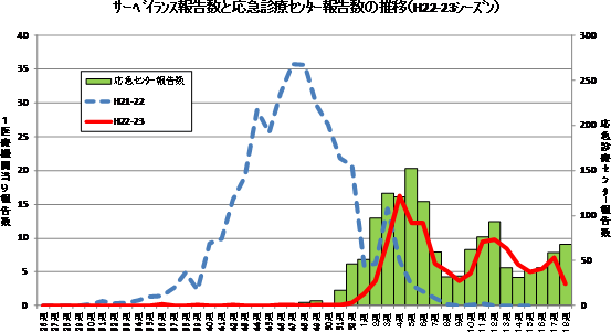 2011年第1週には31件と報告数の増加が見られました。第2週以降は20件から10件前後で推移しています。