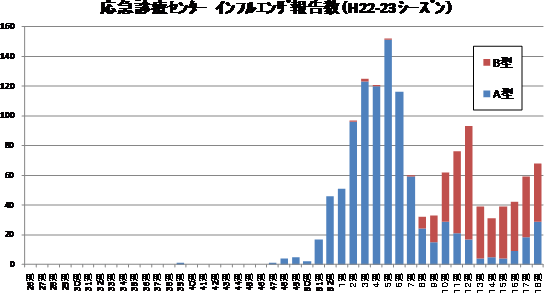 2010-2011年シーズンは、第1週26件(定点当り1.73)から第2週55件(定点当り3.67)、第3週144件(定点当り9.60)に急増、第4週では243件(定点当り16.2)で注意報発令されました。これが第1のピークで、第7週には93件と注意報値を下回りました。ウイルスサーベイランスの結果より、A/H1(2009)の流行によるものです。その後さらに減少しましたが、第10週は71件に逆転増加し、第11週141件、第12週146件とさらに増加し2つ目のピークを形成しています。その後緩やかに減少していますが、第16週から再度増加に転じ、第17週107件と第3のピークを形成しました。第18週は48件に減少しましたが、連休中ですので、今後の動向に今しばらく注意が必要です。集団感染事例もありB型が中心です。A型はA香港型です。
