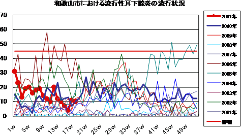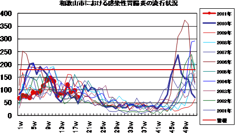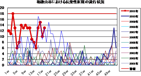 2011年17・18W(ゴールデンウィーク)の和歌山市5類感染症(定点把握)の発生状況です。