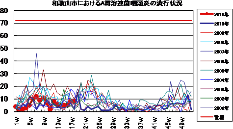 和歌山市では、2006年では第10週をピークに流行が続きましたが、2007年・2008年は大きな流行がなく少数報告にとどまりました。2009年は、第30〜32週ごろをピークに緩やかな流行を示しました。2010年は、おおむね10-20件前後でほぼ横ばいの傾向でした。