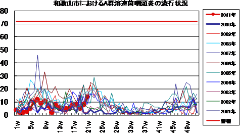 和歌山市では、2006年では第10週をピークに流行が続きましたが、2007年・2008年は大きな流行がなく少数報告にとどまりました。2009年は、第30〜32週ごろをピークに緩やかな流行を示しました。2010年は、おおむね10-20件前後でほぼ横ばいの傾向でした。