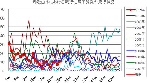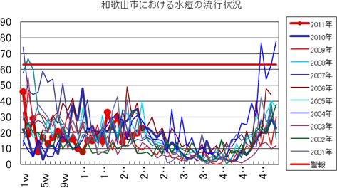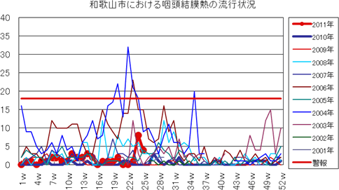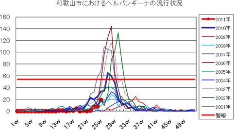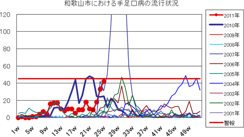 2011年は、第20週18件、一度減少し、第23週18件、第24週33件、と再び増加傾向となり、第25週は42件と更に報告数が増えました。県下においても、海南市など既に警報値を超えている地域もありますので、今後和歌山市内でも更に流行する可能性があります。ご注意下さい。