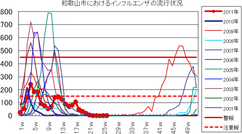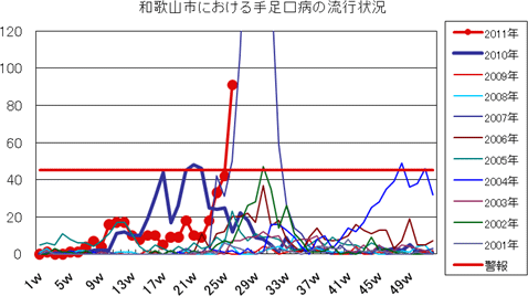 2011年は、第23週より増え始め、第24週33件、第25週は42件と増加し、第25週91件と一気に増加し、警報が発令されました。2007年の流行に匹敵するほどの大流行です。全国的には西日本を中心に流行しており、和歌山県全域でも流行中です。