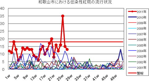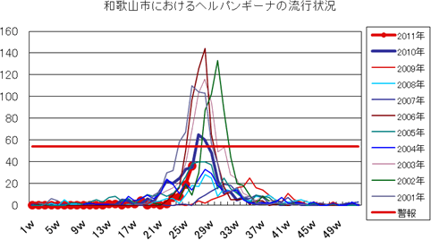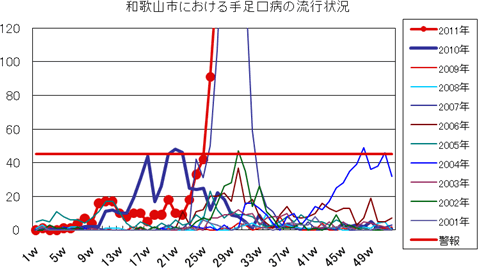 2011年は、第23週より増え始め、第24週33件、第25週は42件、第25週91件と一気に増加し、警報が発令されました。第27週も151件と4週連続増加し、警報発令継続です。2007年の流行に匹敵する規模の大流行です。全国的には西日本を中心に流行しており、和歌山県全域でも流行中です。