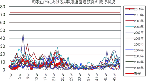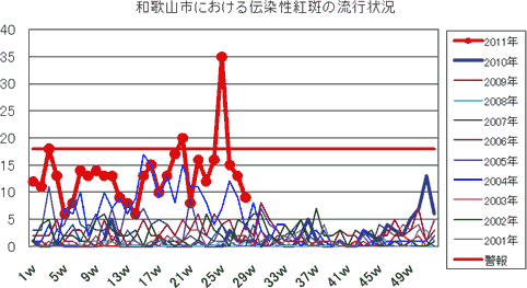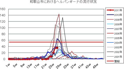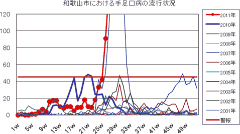 2011年は、第23週より増え始め、第24週33件、第25週は42件、第25週91件と一気に増加し、警報が発令されました。第27週151件、第28週155件と多数報告が続き、4週連続の警報発令です。2007年の流行に匹敵する規模の大流行です。全国的には西日本を中心に流行しており、和歌山県全域でも流行中です。
