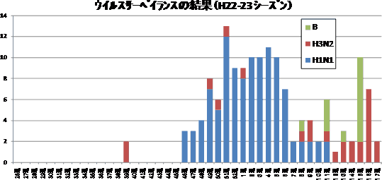 ※3.次の図は、ウイルスサーベイランスの結果です。第8週以降徐々にA/H1(2009)の流行からからA/H3の流行に以降しているのがわかります。