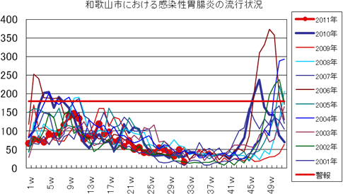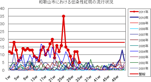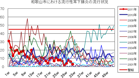2011年は、第23週より報告増え始め、第25週42件、第26週91件と一気に増加し、警報が発令されました。第27週151件、第28週155件(定点当り17.2)と例年より高いピークでしたが、以降第30週63件、第31週37件、第32週31件(定点当り3.44)と報告数減少しました。しかし、まだ報告数は流行警報継続値を上回っており、7週連続で警報発令中です。全国的には西日本を中心に流行しており、和歌山県全体でも報告が多い状況が続いています。