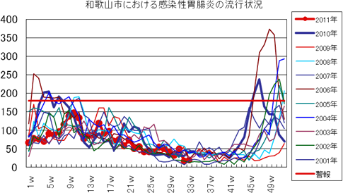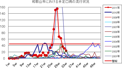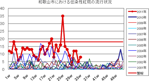 2011年は、第23週より報告増え始め、第25週42件、第26週91件と一気に増加し、警報が発令されました。第27週151件、第28週155件(定点当り17.2)と例年より高いピークでしたが、以降第30週63件、第32週31件、第33週24件(定点当り2.67)と報告数減少しました。しかし、まだ報告数は流行警報継続値を上回っており、8週連続で警報発令中です。