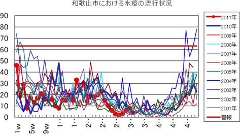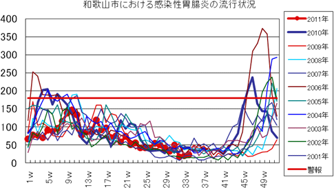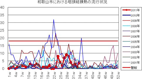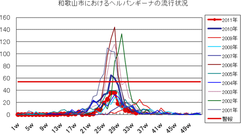 2011年は、第23週より報告増え始め、第25週42件、第26週91件と一気に増加し、警報が発令されました。第27週151件、第28週155件(定点当り17.2)と例年より高いピークでしたが、以降第30週63件、第32週31件、第33週24件と報告数減少傾向となりましたが、警報発令は8週継続しました。第34週、報告15件(定点当り1.67)となり、ようやく警報解除となりました。