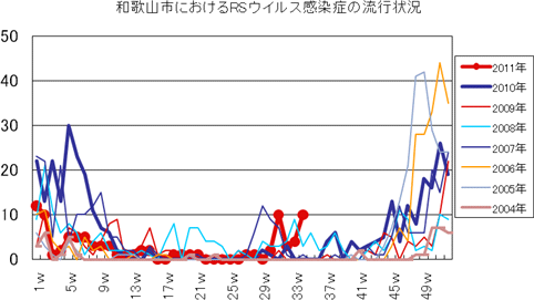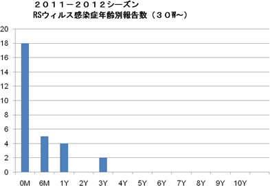 昨シーズン(2010-2011年)は、第45週頃より10件前後の報告がみられるようになり、第51週26件がピークでした。以降徐々に減少傾向となり、2011年第3週以降は5件以内の報告となり、流行終息しました。