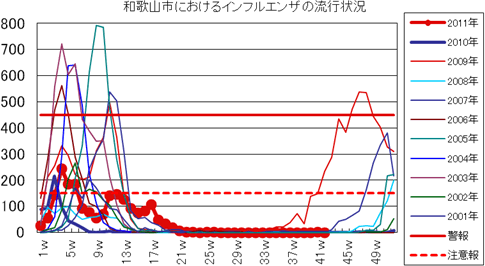 全国的には既にインフルエンザが流行している地域もあります。和歌山市内においても今後インフルエンザが流行するおそれがありますので、今後の動向に注意して下さい。