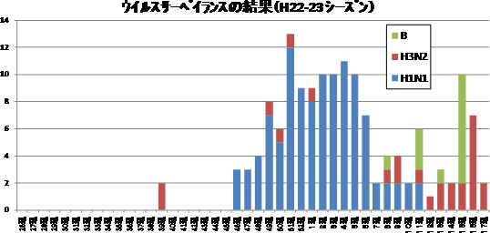 ※次の図は、ウイルスサーベイランスの結果です。第8週以降徐々にA/H1(2009)の流行からからA/H3の流行に以降しているのがわかります。