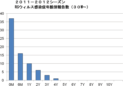 2010-2011シーズンは、例年より早い11月初めから増加し始め、第46週に200件と急増、警報が発令され、第47週が238件とピークでした。年齢別では乳幼児と小学生での報告が中心ですが、おとなの報告もありました。集団生活の場での集団感染事例も発生しました。2011年第1週から第4週の間は70件前後と少なめの報告でしたが、第5週から増え始め、第9週から11週では130件前後に増加しました。第15週頃にも再び120件に増加しましたが、第16週以後減少し、第22週以降概ね50件以下で推移していました。第38週21件、第39週22件、第40週24件、第41週21 件、第42週19件(定点当2.11)でした。