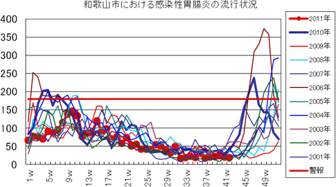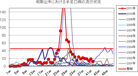 2011年は、第23週より報告増え始め、第25週42件、第26週91件と一気に増加し、警報が発令されました。第28週155件(定点当り17.2)と例年より高いピークとなり、以降徐々に患者数減少し、第34週15件(定点当り1.67)で、8週目で警報解除となりました。警報解除後も、20件前後と例年より多い報告が続きましたが、第40週14件、第41週19件、第42週12件と20件以下に減少してきました。