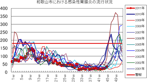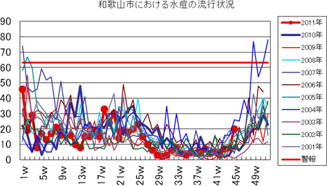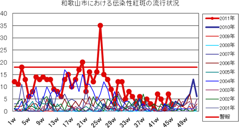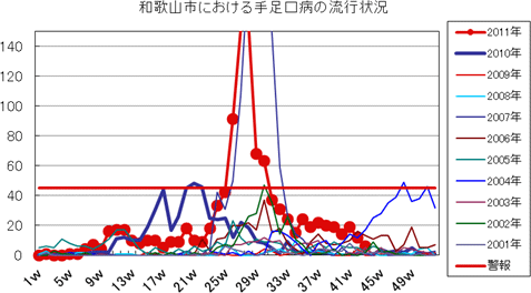 2011年は、第23週より報告増え始め、第25週42件、第26週91件と一気に増加し、警報が発令されました。第28週155件(定点当り17.2)と例年より高いピークとなり、以降徐々に患者数減少し、第34週15件(定点当り1.67)で、8週目で警報解除となりました。警報解除後も、20件前後と例年より多い報告が続きましたが、第43週6件、第42週9件、第45週8件とようやく終息してきました。