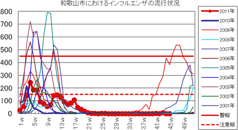 2011年第44週および45週の和歌山市5類感染症(定点把握)の発生状況です。