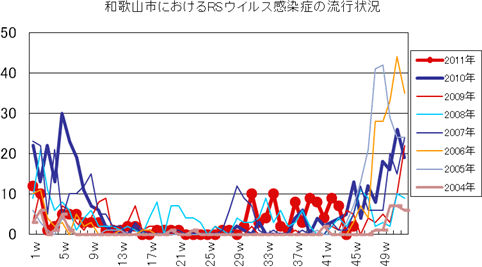 全国の調査では、今年度は例年より早い第30週より全国のRSウィルスの報告が増え始めており、今後RSウィルスが流行する季節ですので、和歌山市内においても今後の動向に注意が必要です。