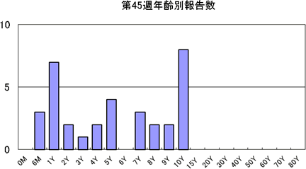 2011年第1週から3週の間と、連休中の第18週から20週の間に小さいピークがありました。その後は落ち着き、第28週以降、10件以下の少ない報告が続いていましたが、第43週7件、第44週8件より、第45週20件と報告大幅に増加しました。