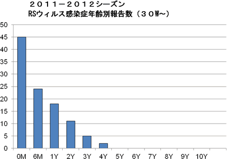 昨シーズン(2010-2011年)は、第45週頃より10件前後の報告がみられるようになり、第51週26件がピークでした。以降徐々に減少傾向となり、2011年第3週以降は5件以内の報告となり、流行終息しました。