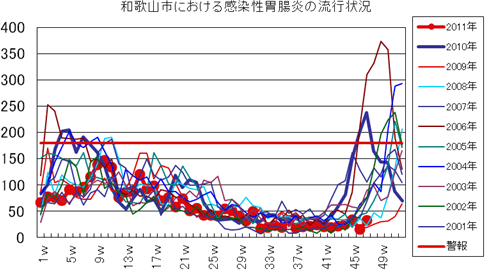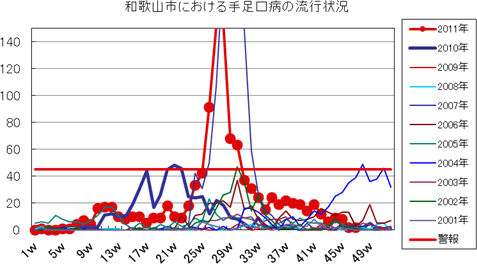 2011年は、第23週より報告増え始め、第25週42件、第26週91件と一気に増加し、警報が発令されました。第28週155件(定点当り17.2)と例年より高いピークとなり、以降徐々に患者数減少し、第34週15件(定点当り1.67)で、8週目で警報解除となりました。警報解除後も、20件前後と例年より多い報告が続きましたが、第42週9件、第45週8件、第46週2件、第47週2件とようやく終息してきました。