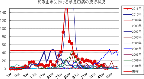 2011年は、第23週より報告増え始め、第25週42件、第26週91件と一気に増加し、警報が発令されました。第28週155件(定点当り17.2)と例年より高いピークとなり、以降徐々に患者数減少し、第34週15件(定点当り1.67)で、8週目で警報解除となりました。警報解除後も、20件前後と例年より多い報告が続きましたが、第42週9件、第45週8件、第46週2件、第47週2件、第48週5件とようやく終息してきました。