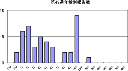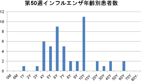 第44週以降、報告0件で続きましたが、第49週11件、第50週49件(定点当り3.27)と、急に増加し始めました。4歳から小学校低学年までの報告が中心で、今後学校から地域への流行にも注意が必要です。今後の動向に注意して下さい。