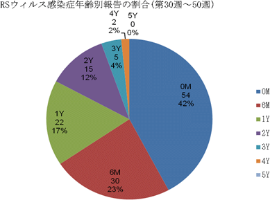 全国の調査では、今年度は例年より早い第30週よりRSウィルスの報告が増え始め、流行しています。一時増加は緩やかになりましたが、同時期に比べて、報告は多いです。