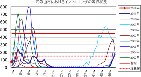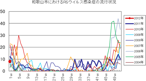 2012年第1週の和歌山市5類感染症(定点把握)の発生状況です。