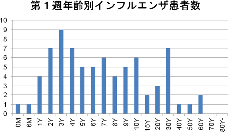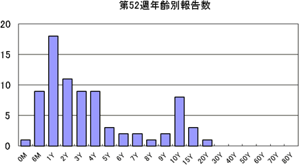 第51、52週の年齢別患者数報告は小学校低学年から中学年の報告が大部分でしたが、第1週では就学前の患者の割合が大きく増えました。また、成人の患者も増えています。