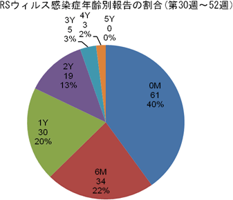 全国の調査では、今年度は例年より早い第30週よりRSウィルスの報告が増え始め、流行しています。一時増加は緩やかになりましたが、同時期に比べて、報告は多いです。
