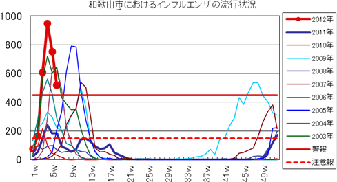 和歌山市内においては、第38週より1〜2件の報告が続きました。2012年に入り、0〜1件の報告が続きましたが、第5週は7件の報告がありました。第6週は1件でした。今後の動向に注意が必要です。