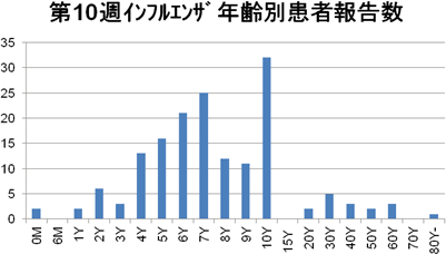 市内でのインフルエンザ流行拡大に伴い、インフルエンザ入院患者数が急激に増加し、第4週は24人でした。その後入院患者数は減少し、第5週入院患者数19人、第6週12人、第7週以降10人以下となり、第9週は3人でした。入院患者の年齢は10歳未満と65歳以上に集中しています。