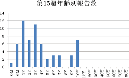 2012年も10件以下の報告が続き、第8週8件、第9週8件、第10週7件、第11週4件、第12週2件、第13週で6件でした。第14週では3件、第15週も3件、第16週で5件でした。