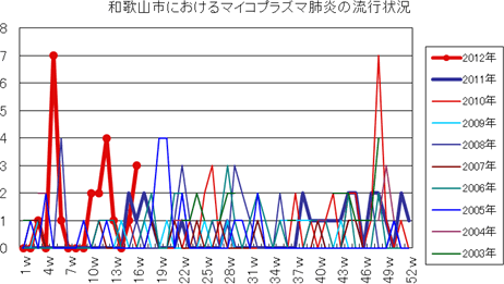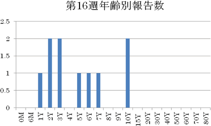 2012年の第5週は7件の報告がありましたが、以降、第8週0件、第9週0件、第10週2件、第11週2件(定点当り0.67)、第12週4件、第13週で1件、14週で0件、第15週で1件、第16週で3件でした。