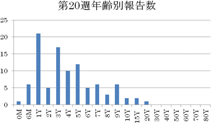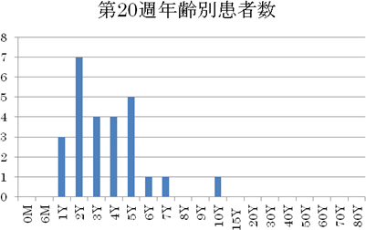 2012年に入り報告数減少し、10件前後で推移し、第8週10件、第9週17件、第10週9件でした。第11週は22件(定点当り2.44)とやや増加し、第12週19件(定点あたり2.11)、第13週では17件(定点あたり1.89)、14週で13件(定点あたり1.44)、第15週で14件(定点あたり1.56)、第16週で10件(定点あたり1.11)でした。第17週で11件(定点あたり1.22)、第18週(定点あたり1.22)で11件、第19週では14件の報告がありました。第20週で26件と増加しています。