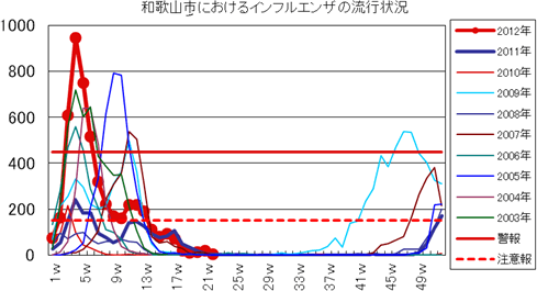昨年の第49週より患者報告が増え始め、第52週171件(定点当り11.4)となり、流行発生注意基準値を超えました。学校等が冬季休暇中だった2012年第1週は76件とやや減少しましたが、第2週より163件(定点当り10.9)と再び増加に転じました。第3週に報告609件(定点当り40.6)と急増し、流行発生警報基準値(30)を超えました。第4週は948件(定点当り63.2)で、ここ10年間では最も多い報告でした。その後報告減少し、第8週221件、第9週171件、第10週159件(定点当り10.6)でしたが、第11週が220件(定点当り14.67)と増加しました。第12週も219件(定点あたり14.60)となっています。第13週では191件(定点あたり12.7)とやや減少しています。さらに第14週で110件(定点あたり7.33)と減少し、流行発生警報が解除となり、第15週では81件(定点あたり5.4)とさらに減少しましたが、第16週で92件(定点あたり6.13)とやや増加しています。第17週で70件(定点あたり4.67)と減少傾向を示し、第18週は20件(定点あたり1.33)となっています。第19週では11件(定点あたり0.73)となり、インフルエンザの流行はようやく終息しました。第20週では14件(定点あたり0.93)と横ばいです。第21週で20件(定点あたり1.33)と増加しましたが、第22週で3件(定点あたり0.2)となり、インフルエンザもようやく終息のようです。
