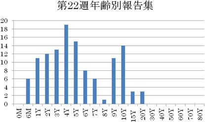 2012年も10件以下の報告が続き、第8週8件、第9週8件、第10週7件、第11週4件、第12週2件、第13週で6件でした。第14週では3件、第15週も3件、第16週で5件、第17週で5件、第18種で7件、第19週では3件でした。第20週で5件、第21週で4件、第22週では2件と、10件以下の報告でした。